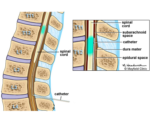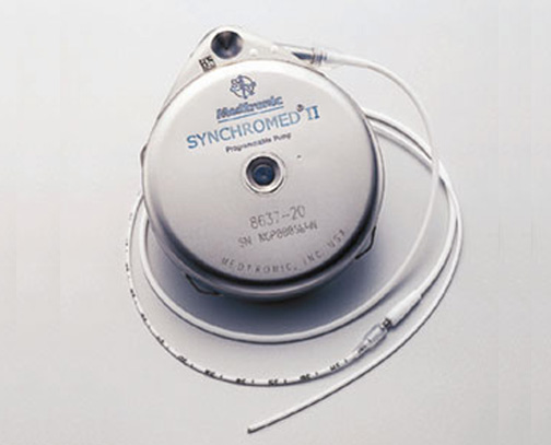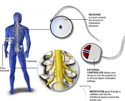 The Intrathecal Pump Implant, also known as the Morphine Spinal Pump, is a treatment option for patients suffering from severe chronic pain who failed other forms of treatment. It is especially beneficial for patients who are unable to tolerate the effects of oral narcotics (pills) and/or no longer receive pain relief from their medication. The intrathecal space is an area in the spine where spinal fluid flows around the spinal cord, the spinal cord being the "power line" that sends pain signals from the body to the brain. When narcotics are introduced into the intrathecal space, the medication goes directly to the site where pain signals travel. The pump, which is about the size of a hockey puck, is surgically implanted into the abdomen. By connecting a catheter from the pump to the precise location in the spine where the pain is, medication (usually morphine) is pumped directly into the spinal fluid.
