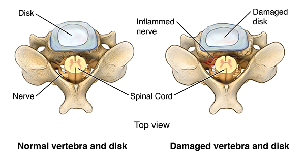 The lumbar area of the spine has five bones, called vertebrae. Soft discs found between them cushion them, hold them together, and control motion. If a disc tears, chemicals inside may leak out. This can inflame the duramater or nerve roots and cause pain. A large disc tear may cause a disc to bulge, inflaming the duramater and nerve roots, and cause pain. Bone spurs, called osteophytes, can also press against nerve roots and cause pain.